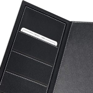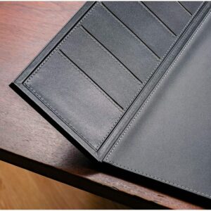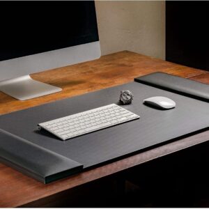 This top-grain black leather 34 x 20 desk mat features outward folding side rails on both sides. The space under the left side rail stores business cards, and the space under the right one holds pens, paper clips and other small stationery items. The leatherette writing surface provides a sturdy and easy to clean writing surface. Designed with high quality components, this Dacasso desk pad will last for years to come.