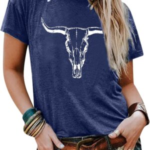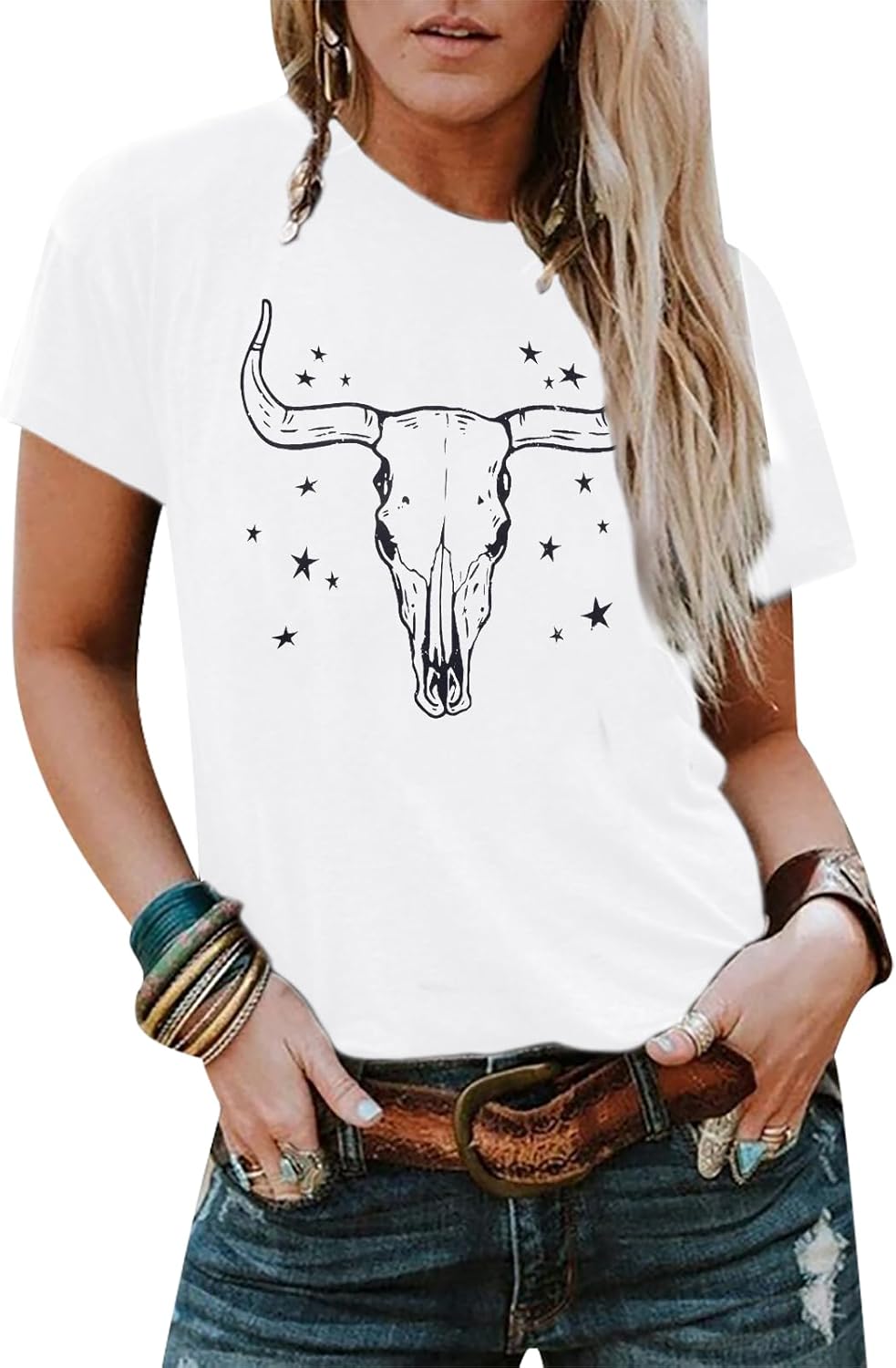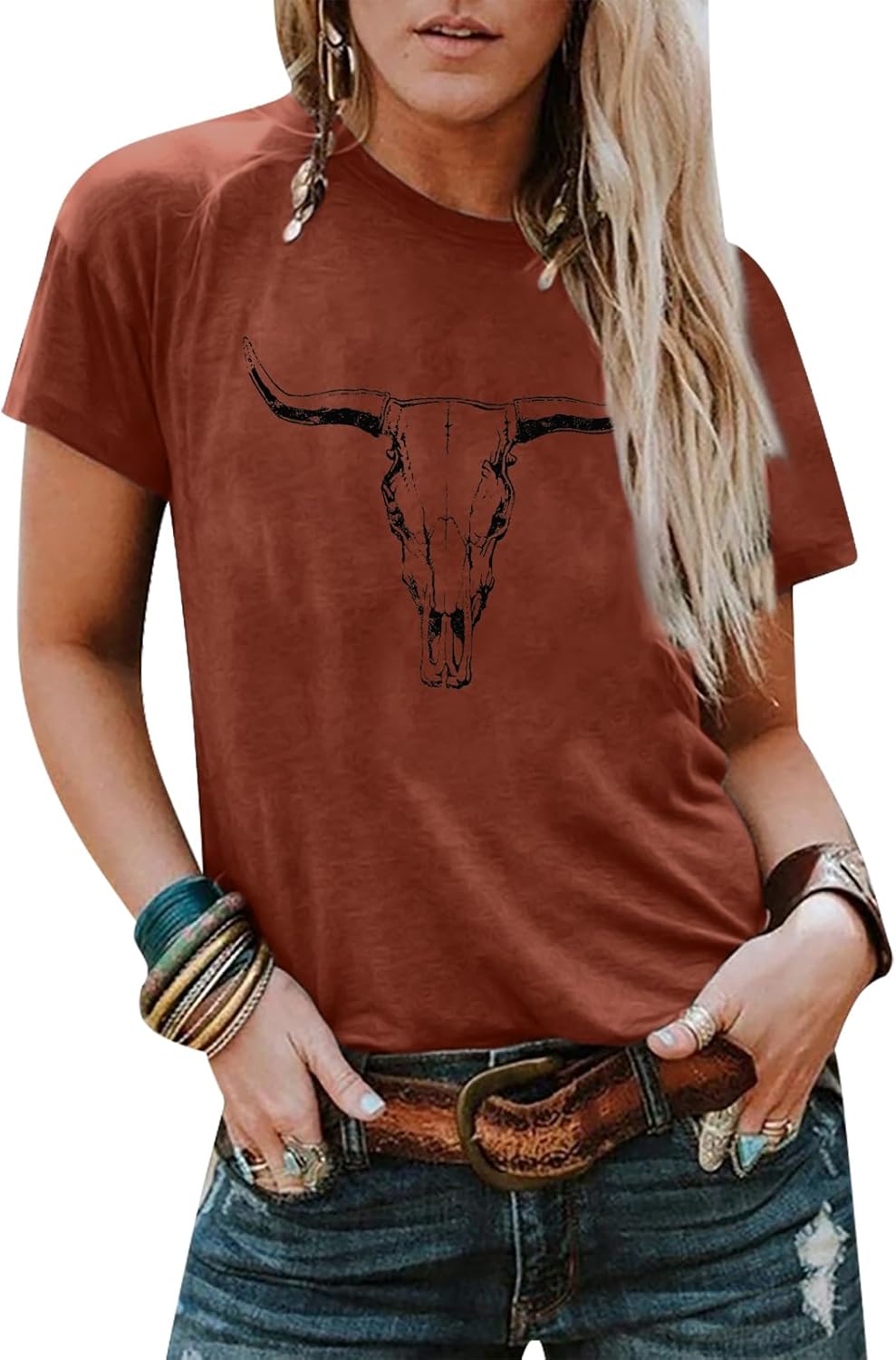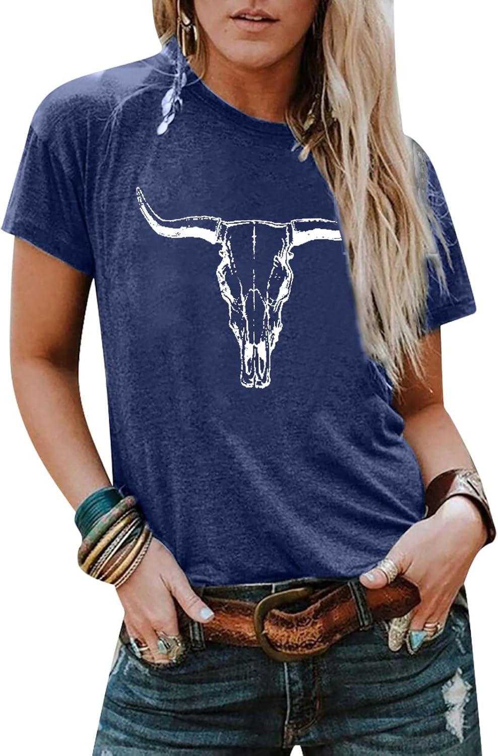 Rodeo Cow Skull Shirts for Women Vintage Western Bull Skull Graphic T-Shirt