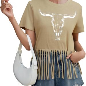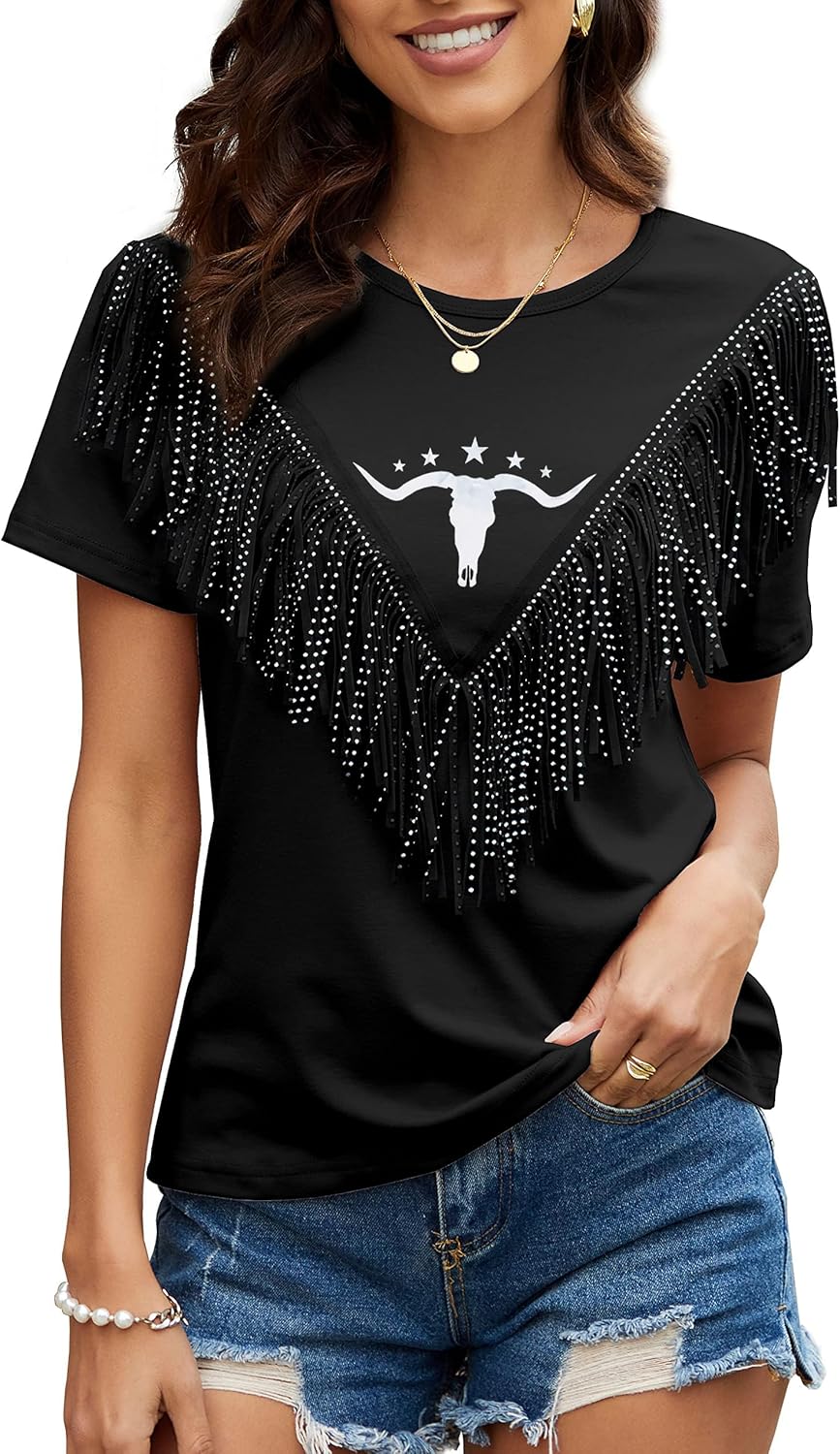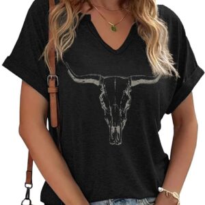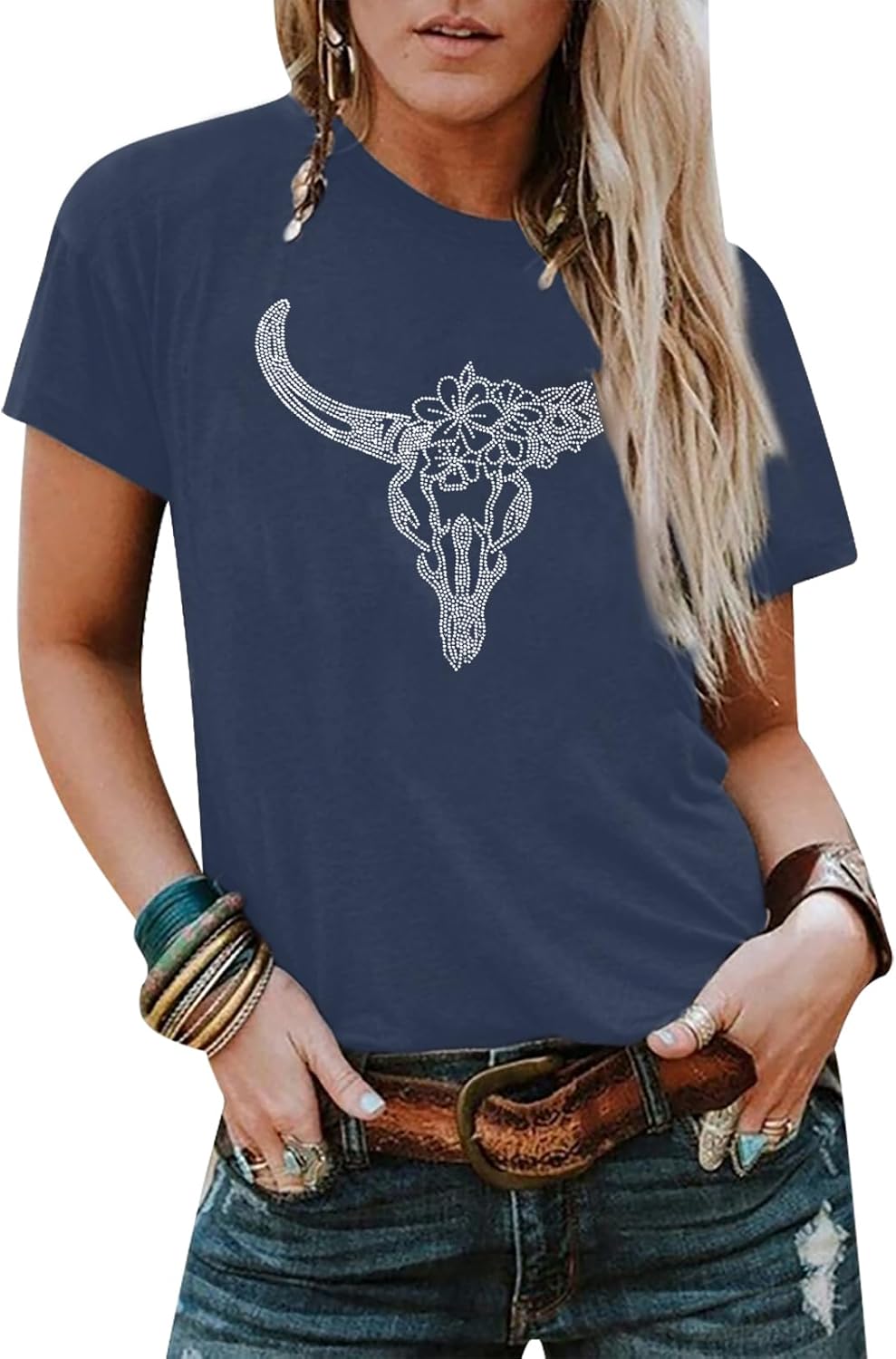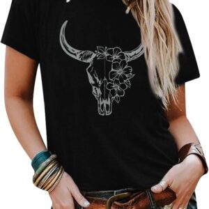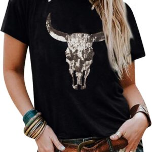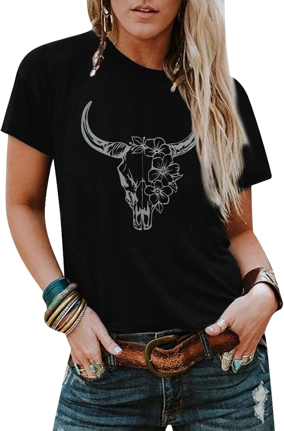 Rodeo Cow Skull Shirts for Women Vintage Western Bull Skull Graphic T-Shirt
