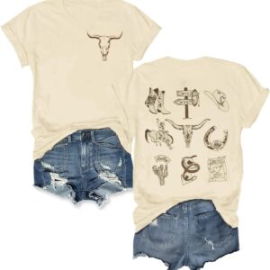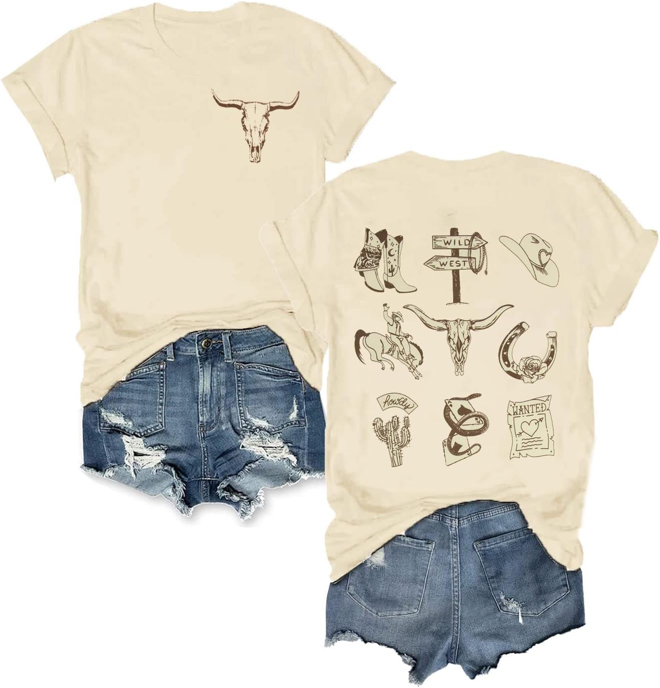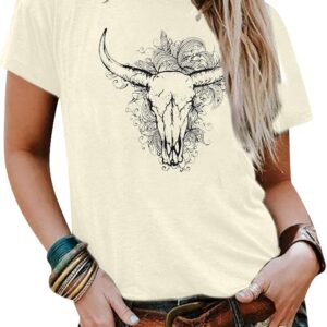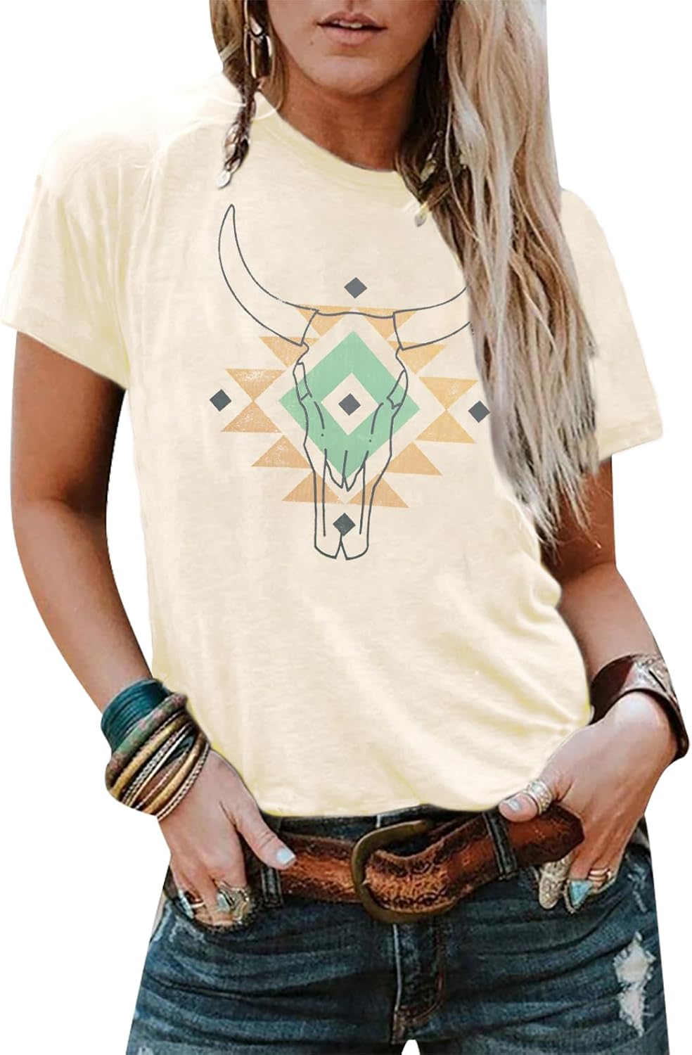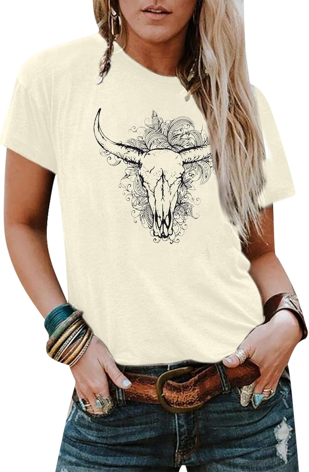 Women Boho Cow Skull Rodeo T-Shirt Vintage Western Graphic Tee Top Short Sleeve