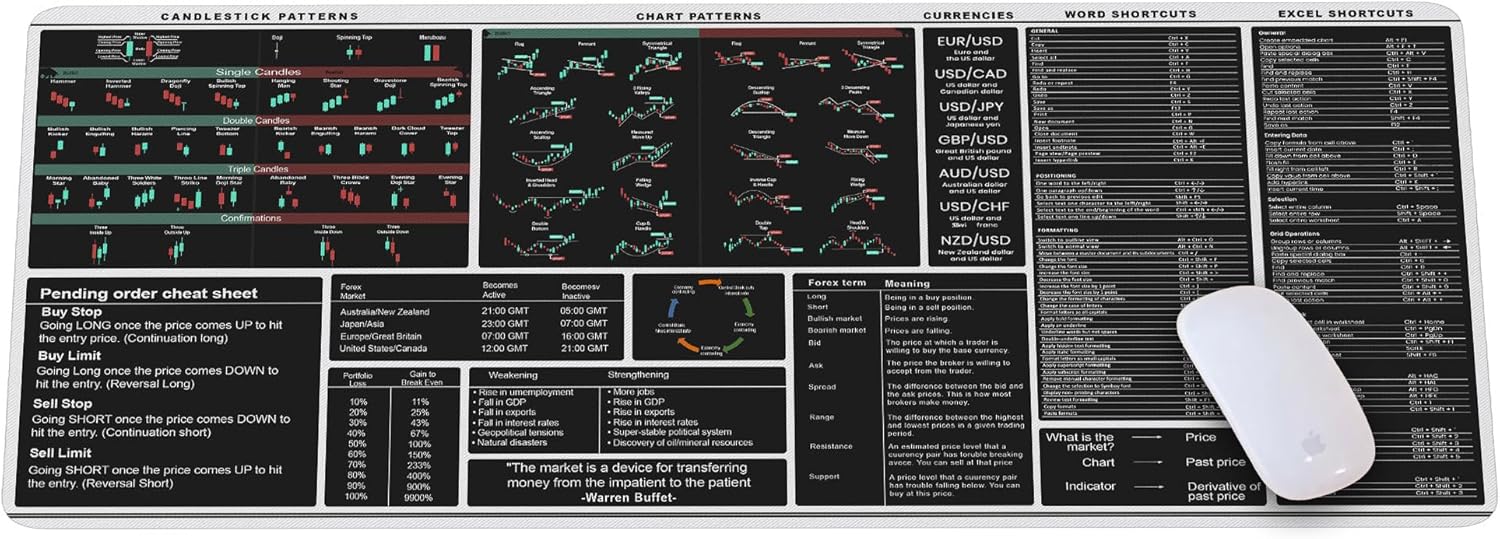 Upgrade your trading desk with this exclusive bundle of 5 Stock Trader Mouse Mats, designed for professionals who live by the charts. Each mat combines a sleek, durable surface with essential trading references, giving you both performance and knowledge at your fingertips.