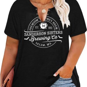 Plus Size Halloween V-Neck T-Shirt Women Sanderson Witch Museum Graphic Tees Hocus Pocus Short Sleeve Shirts Tops