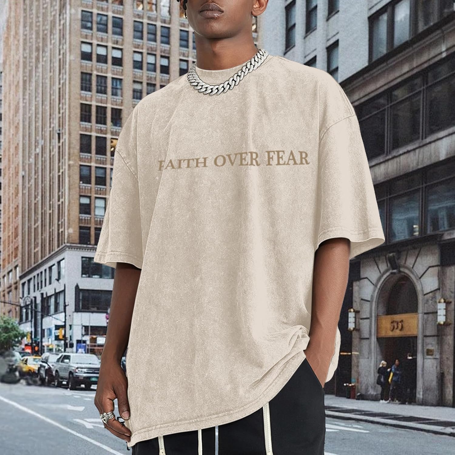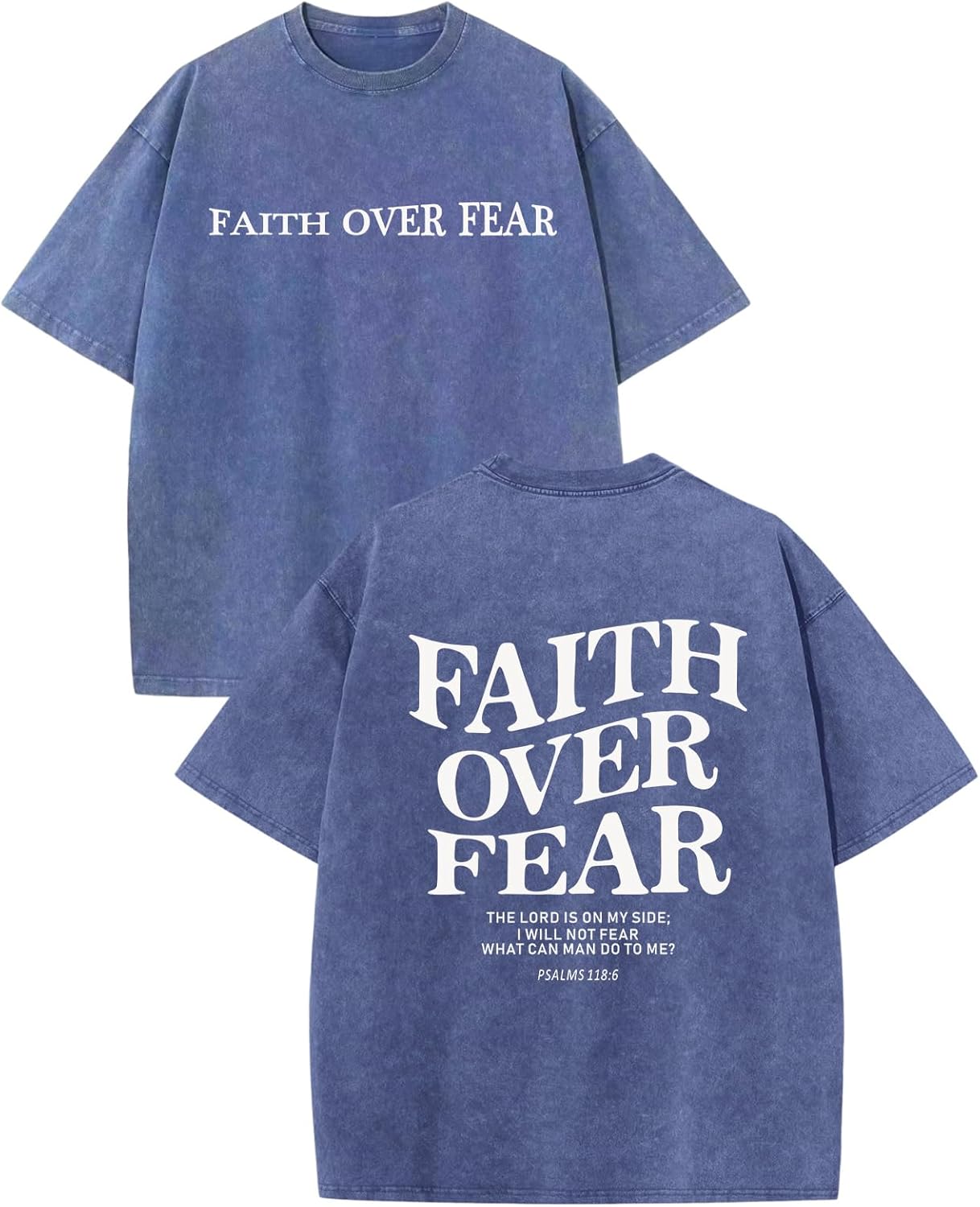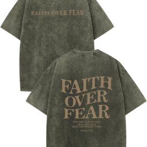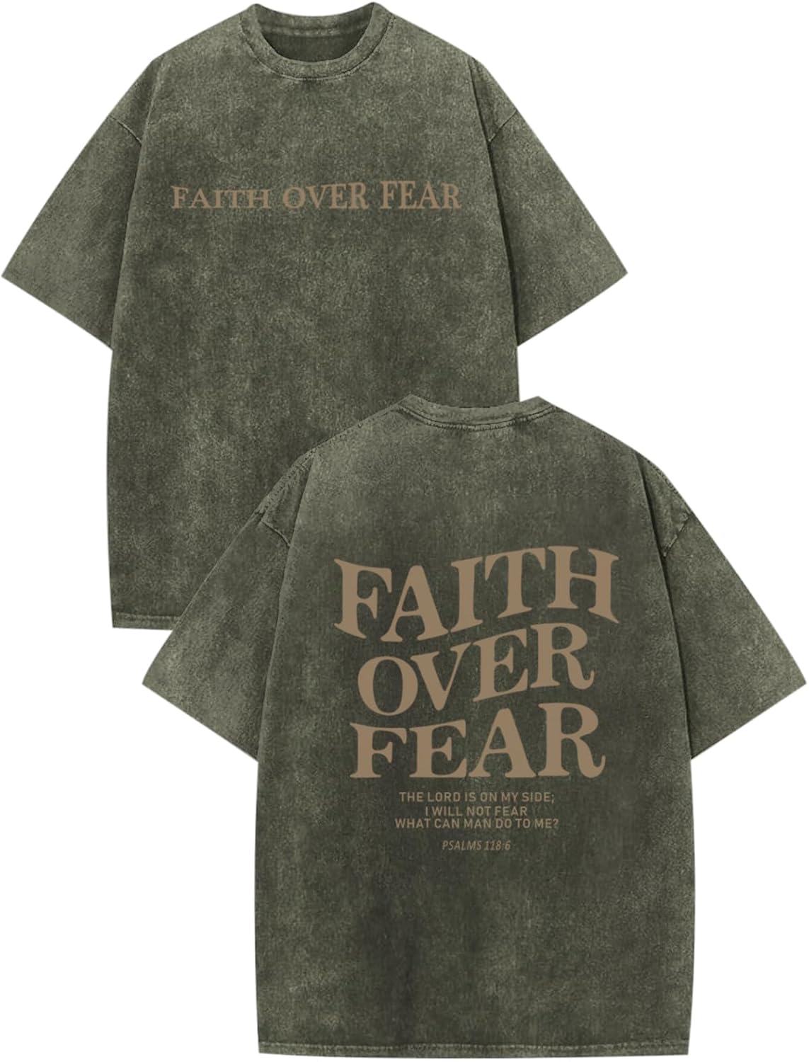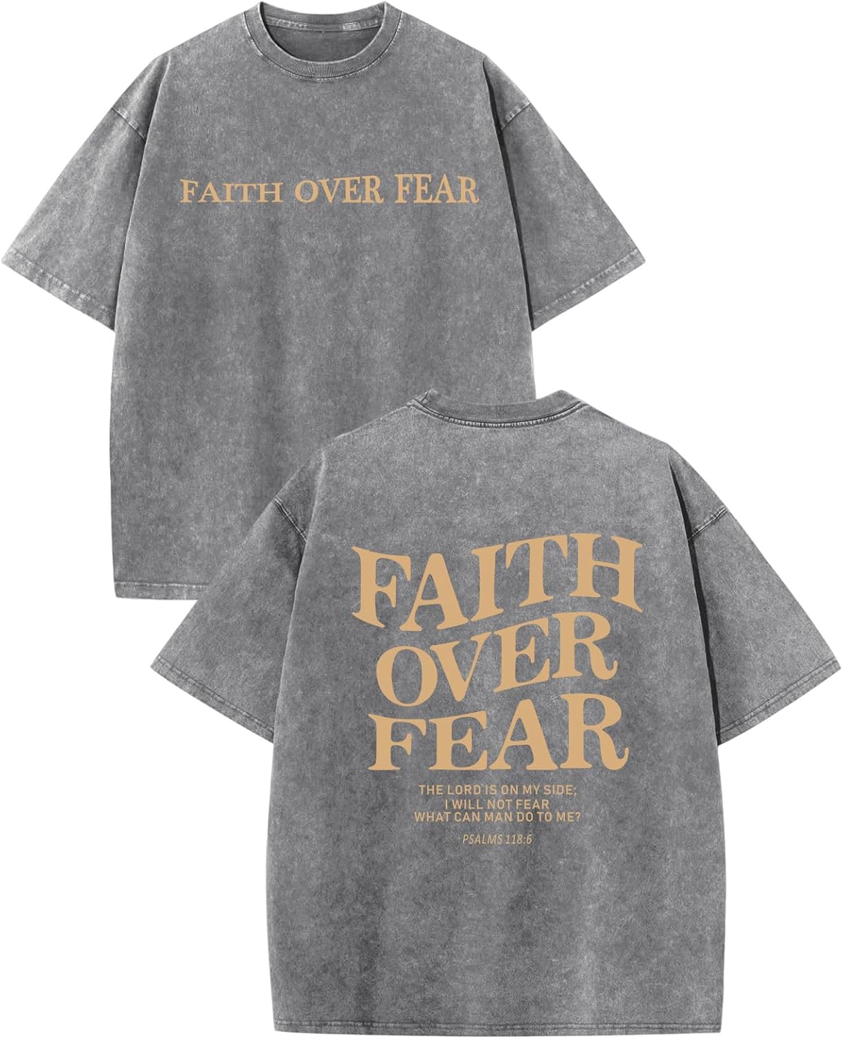 Weetiotio Christian Faith Over Fear Shirt for Men Jesus Religious Shirts Oversized Graphic Tees Acid Wash God