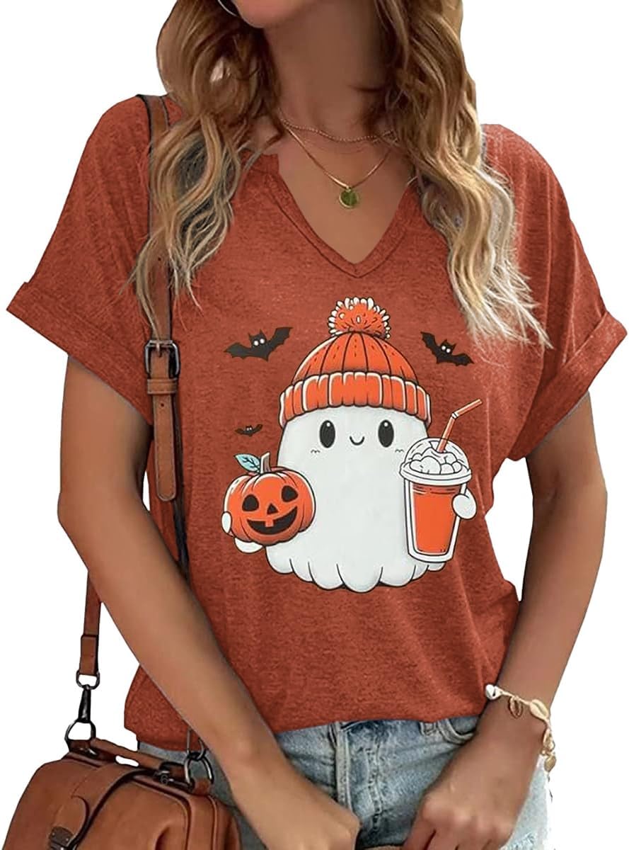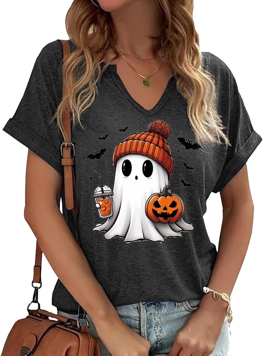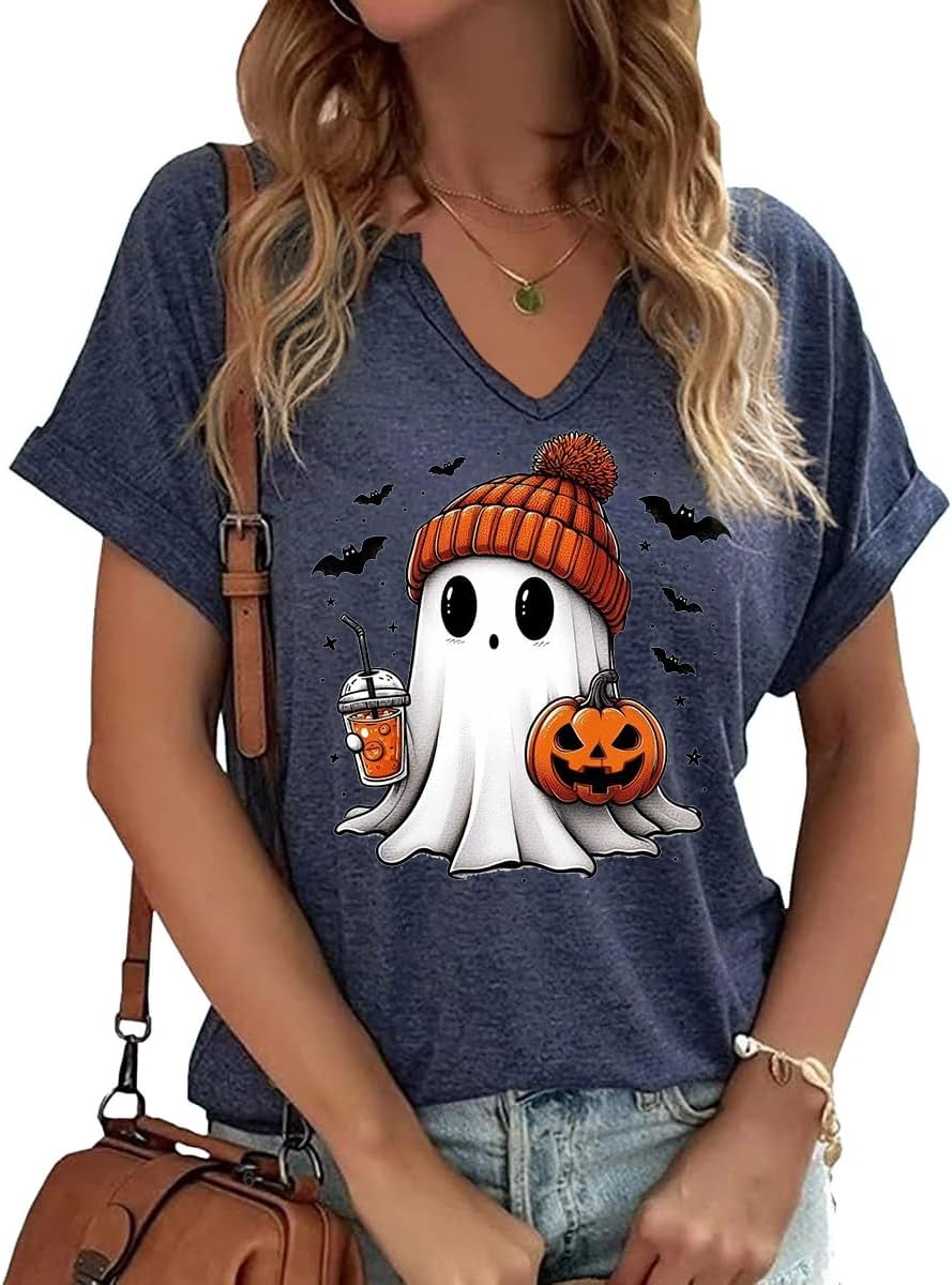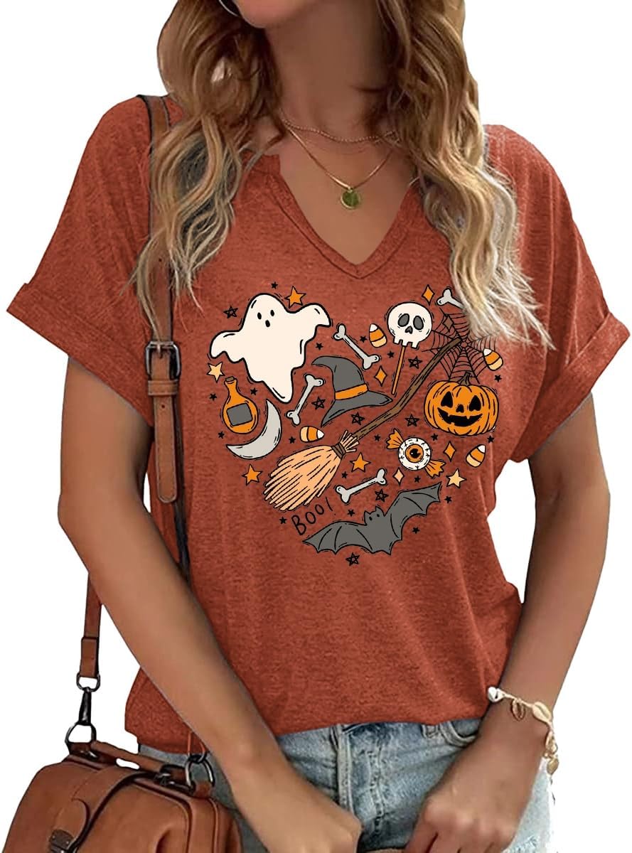 Women Fall Halloween Doodles V Neck Shirt Funny Family Party Celebration Short Sleeve Tee