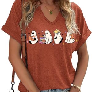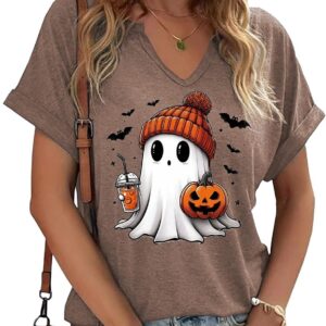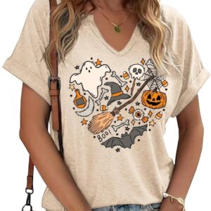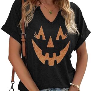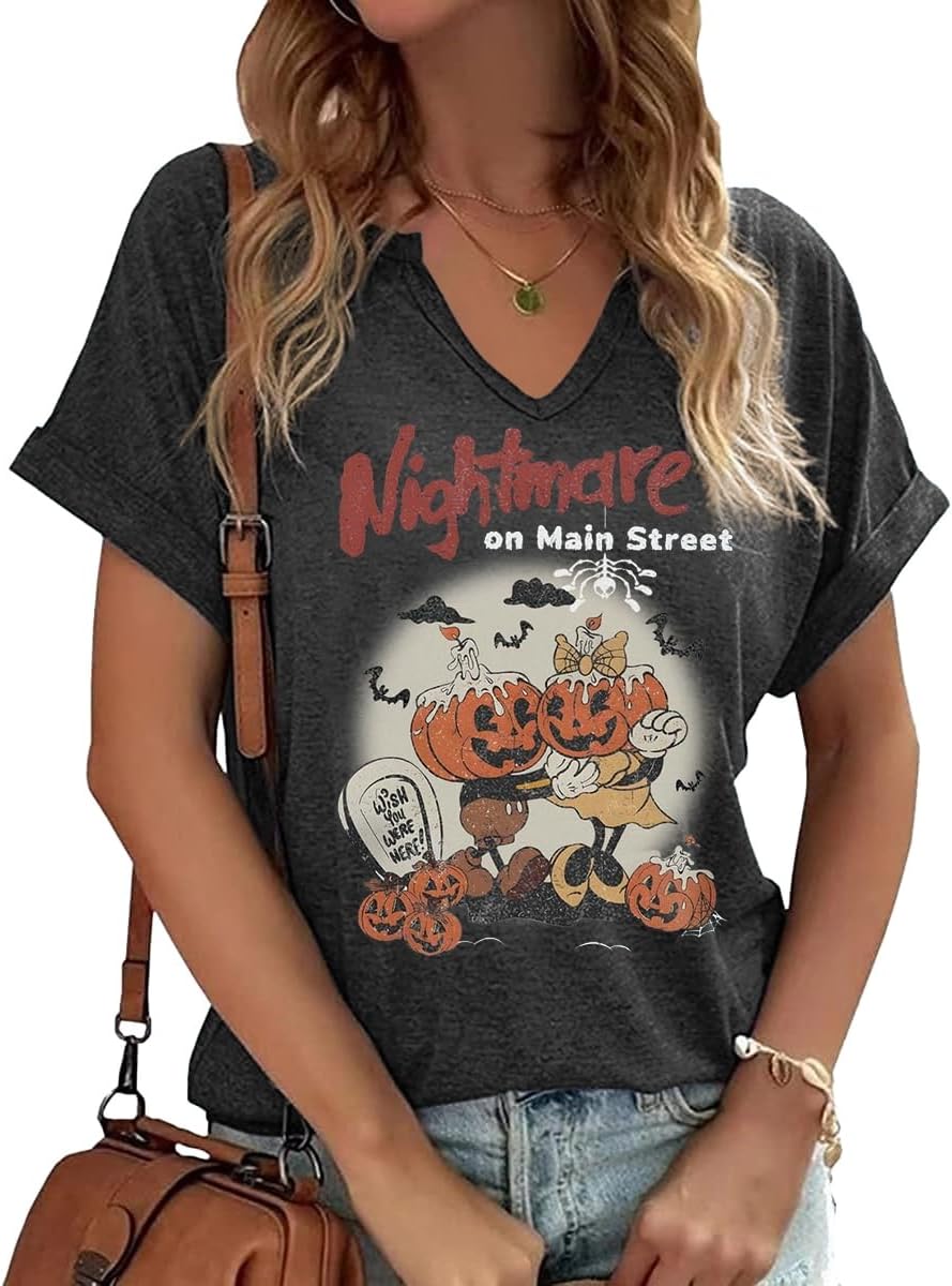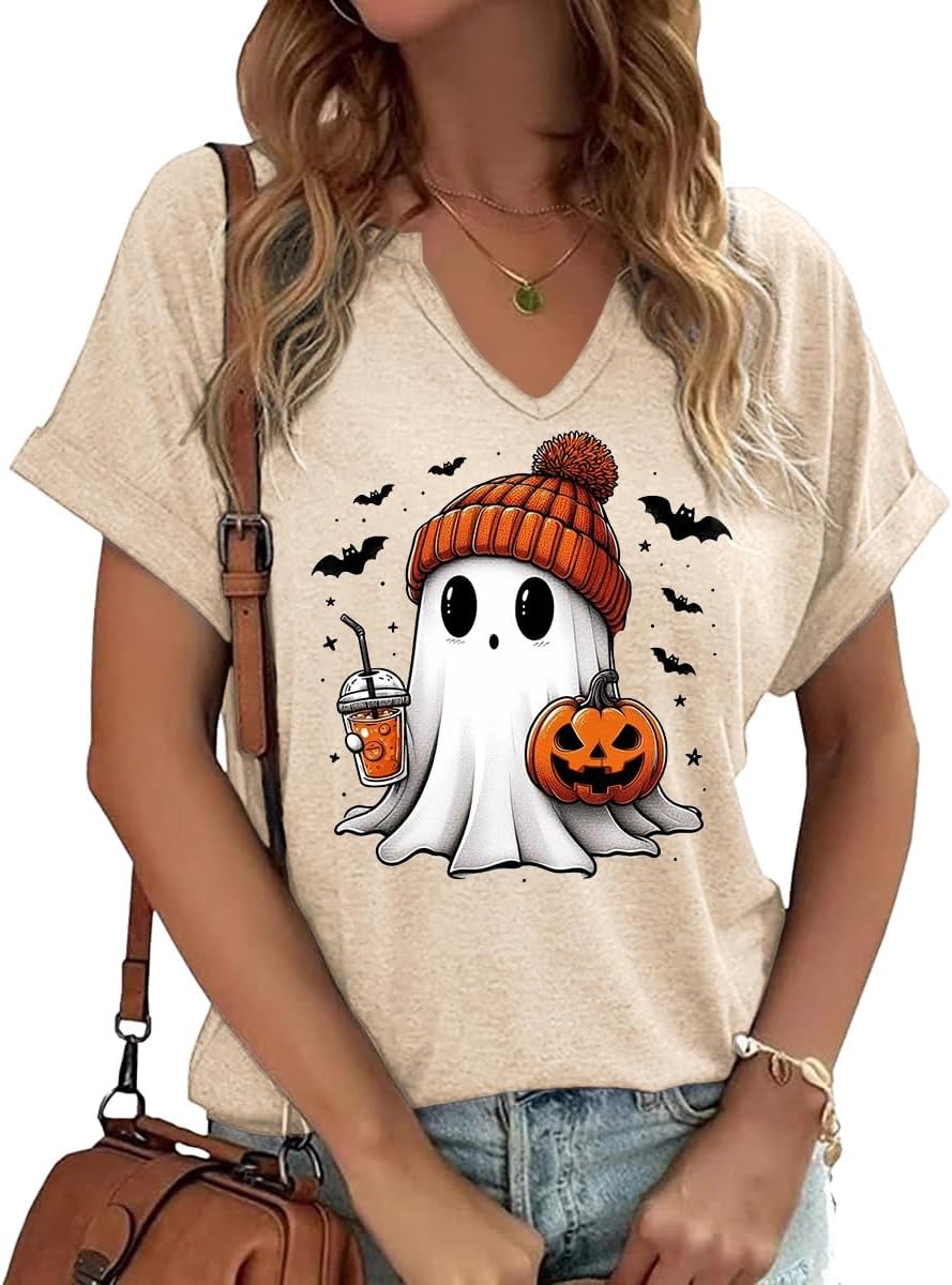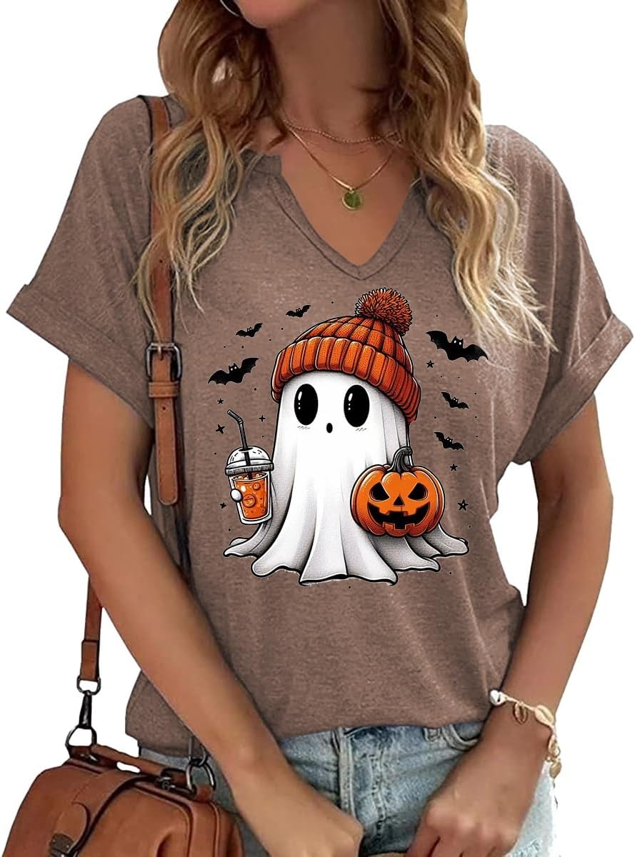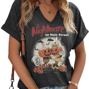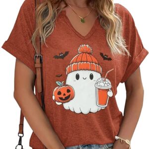 Women Fall Halloween Doodles V Neck Shirt Funny Family Party Celebration Short Sleeve Tee