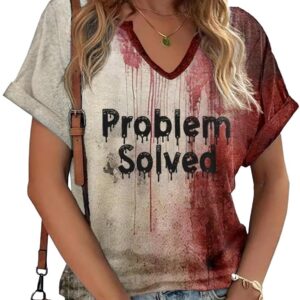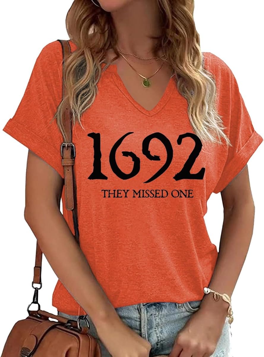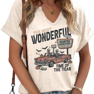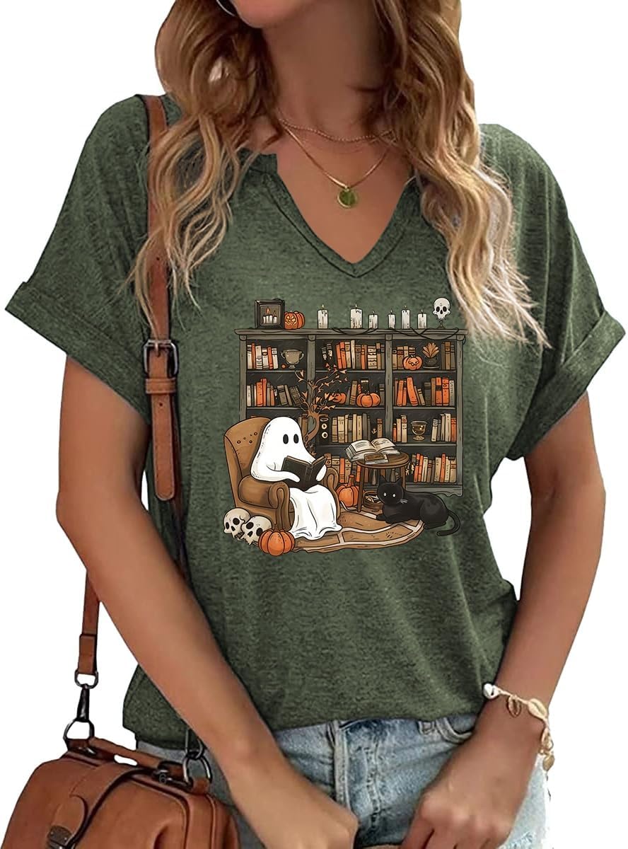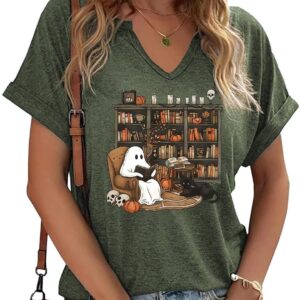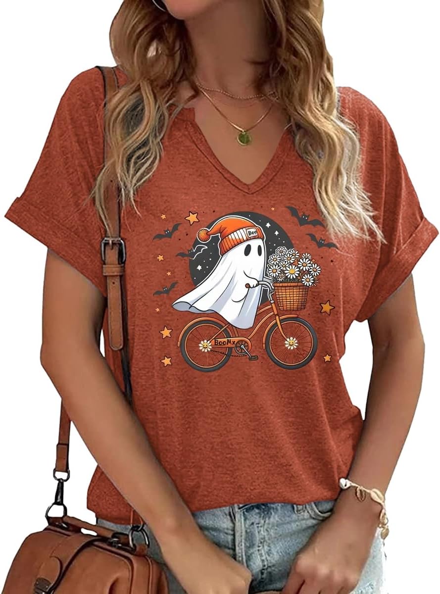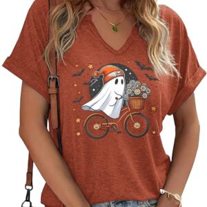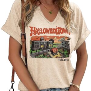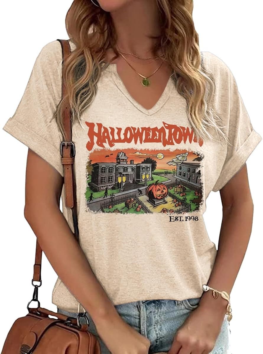Women Fall Halloween Doodles V Neck Shirt Funny Family Party Celebration Short Sleeve Tee