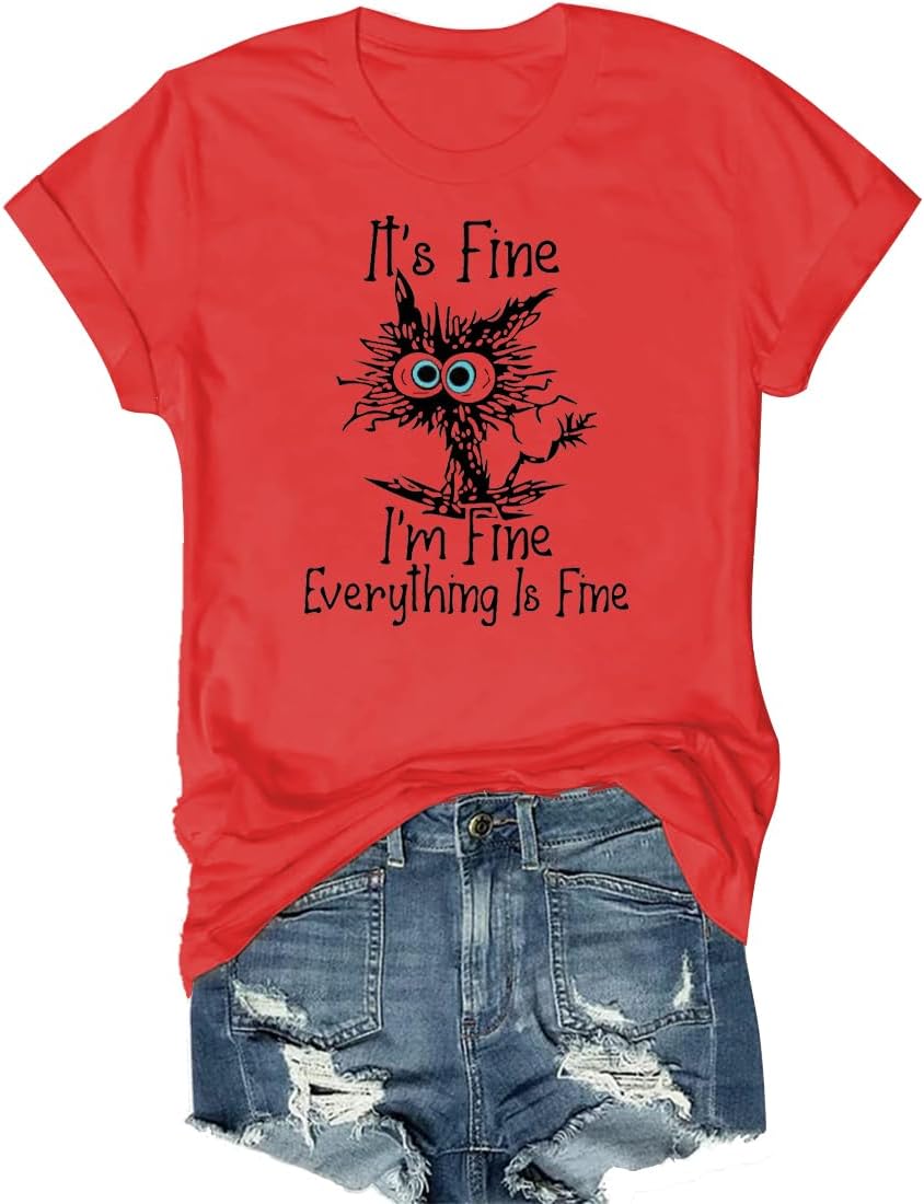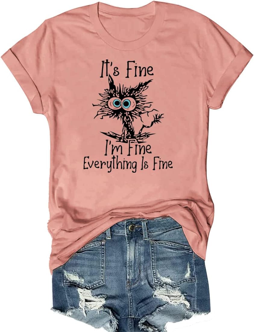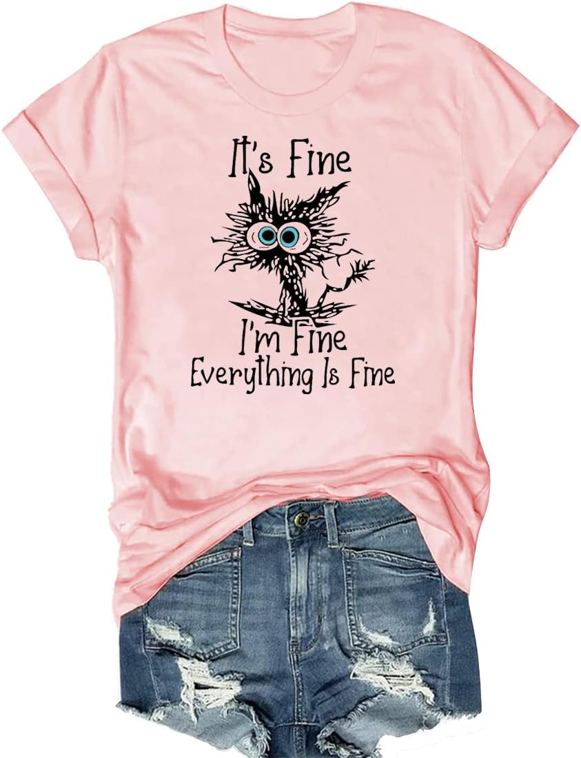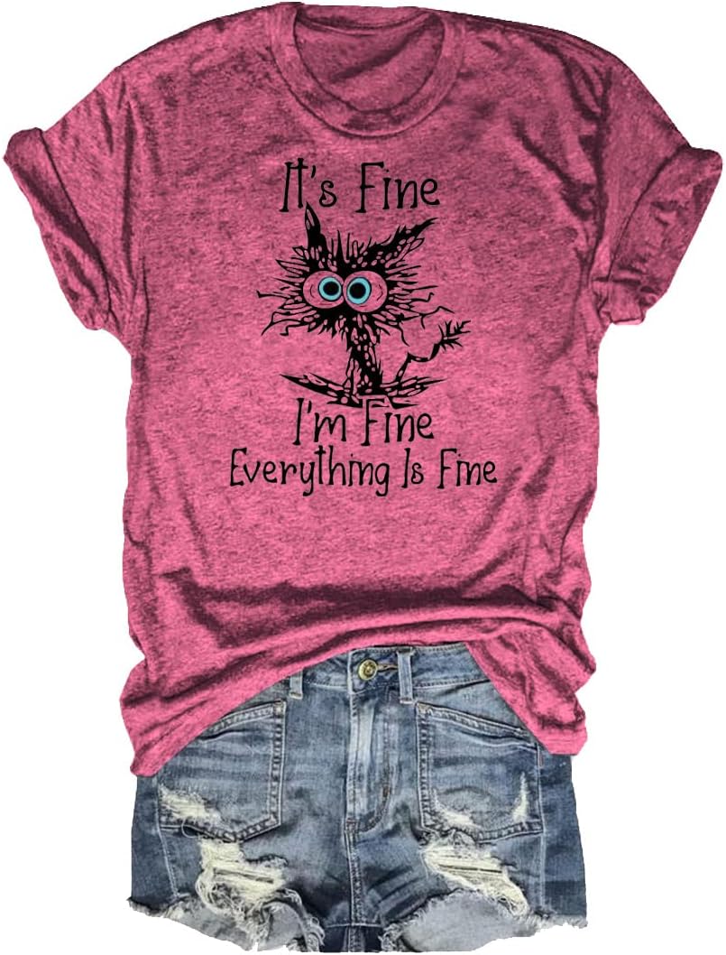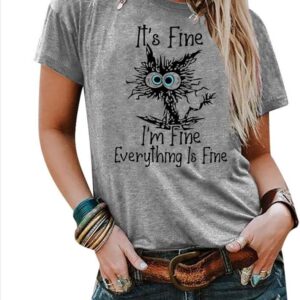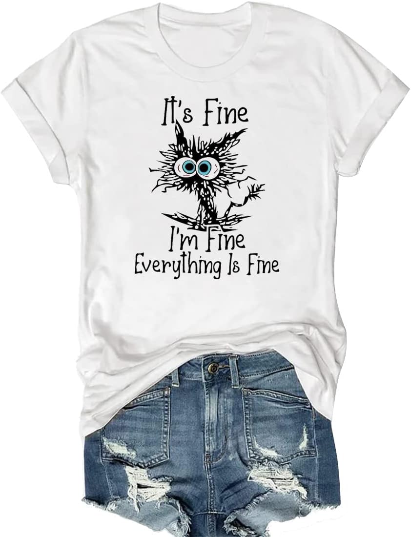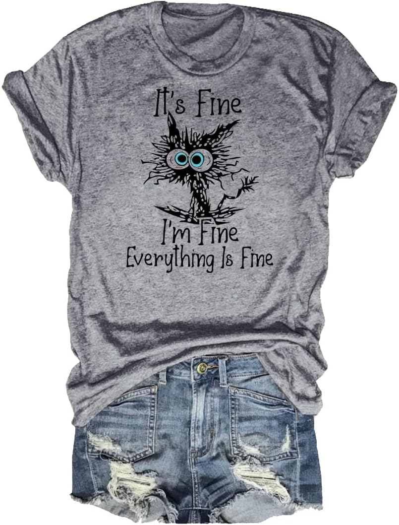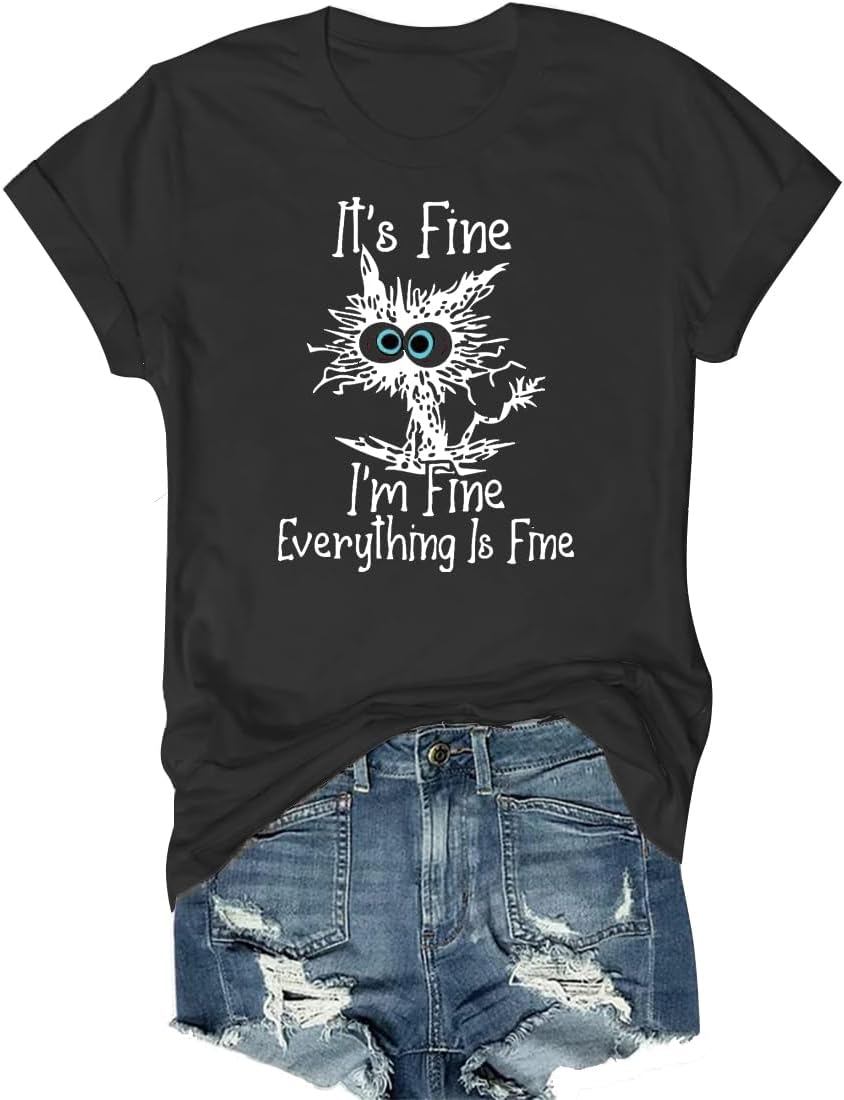 Women’s I’m Fine Everything is Fine T-Shirts Short Sleeve Sayings Loose Fit Casual Cute Cat Graphic Tee Blouse Tops
