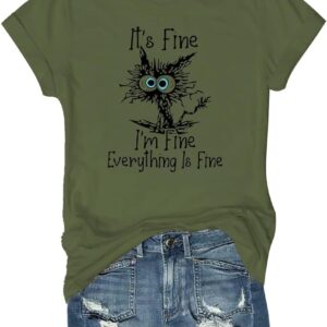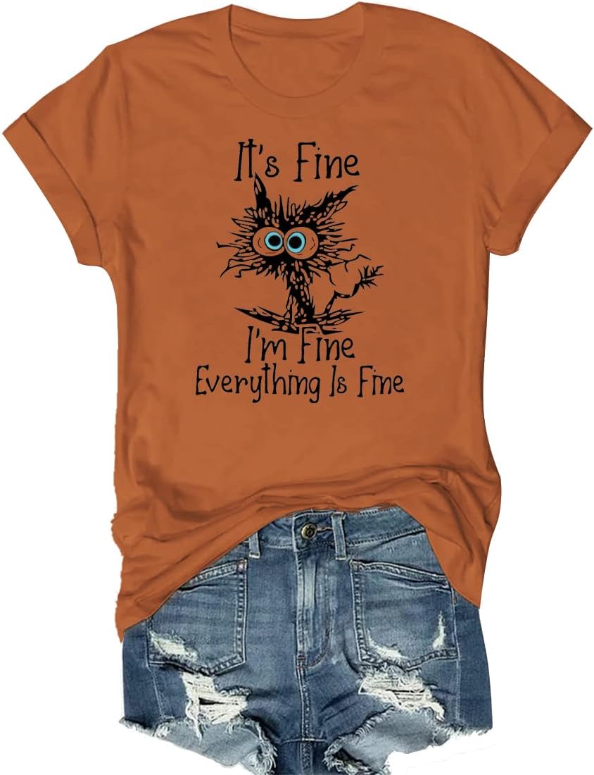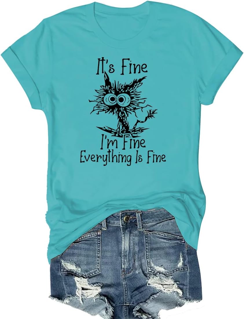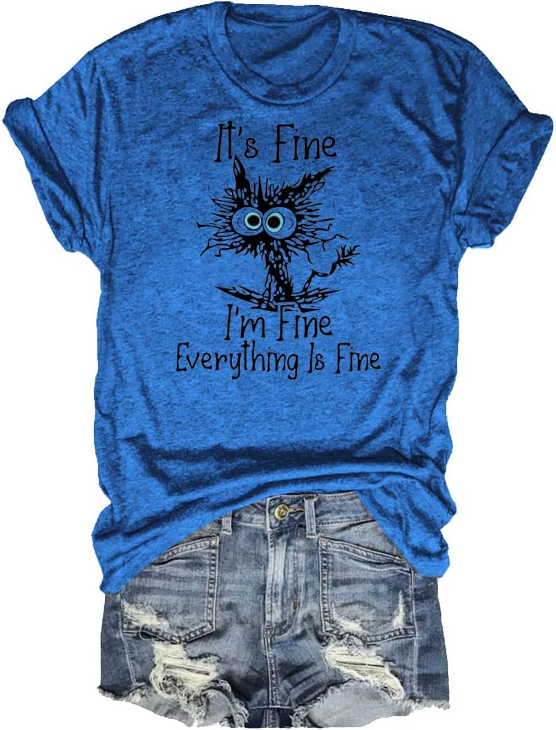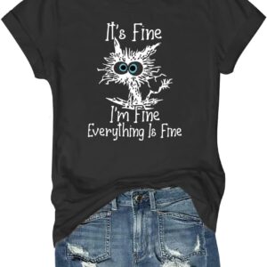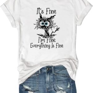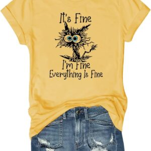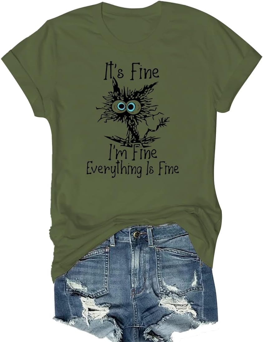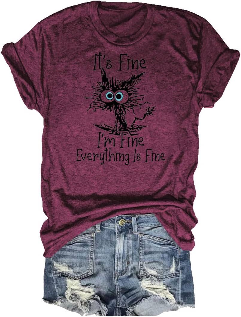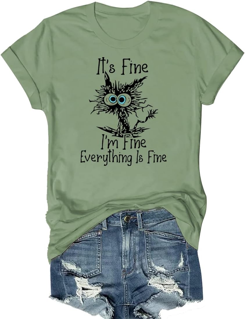 Women’s I’m Fine Everything is Fine T-Shirts Short Sleeve Sayings Loose Fit Casual Cute Cat Graphic Tee Blouse Tops