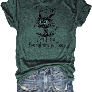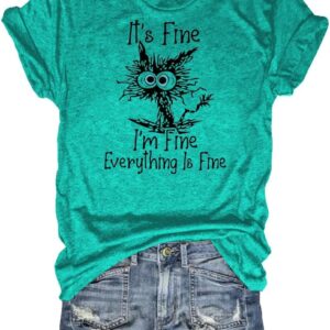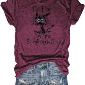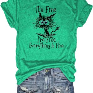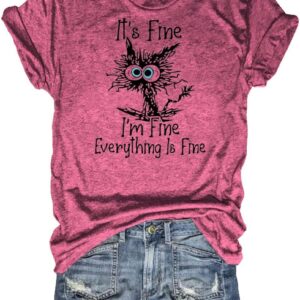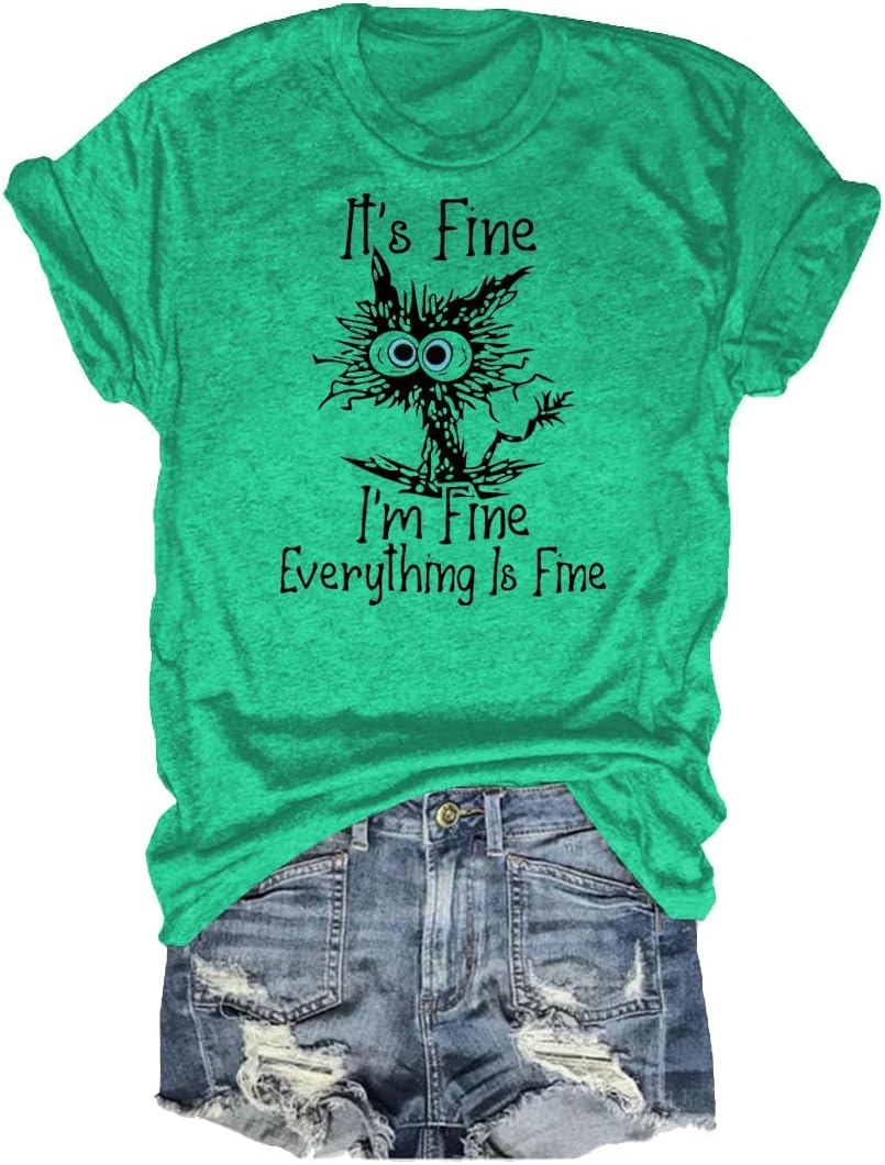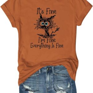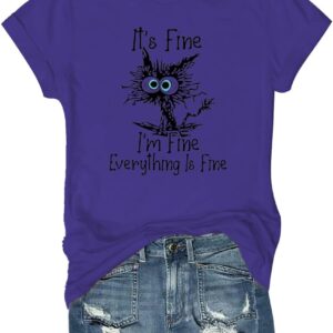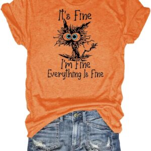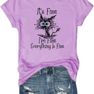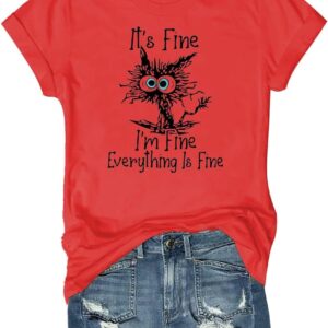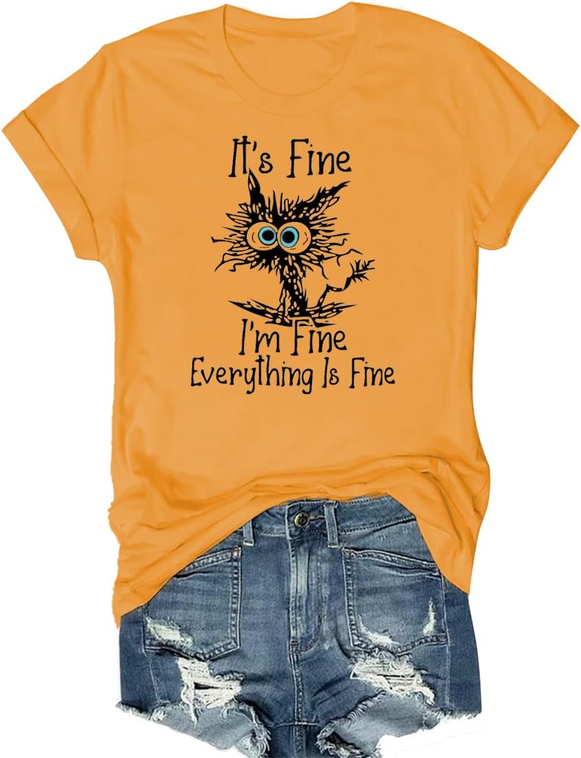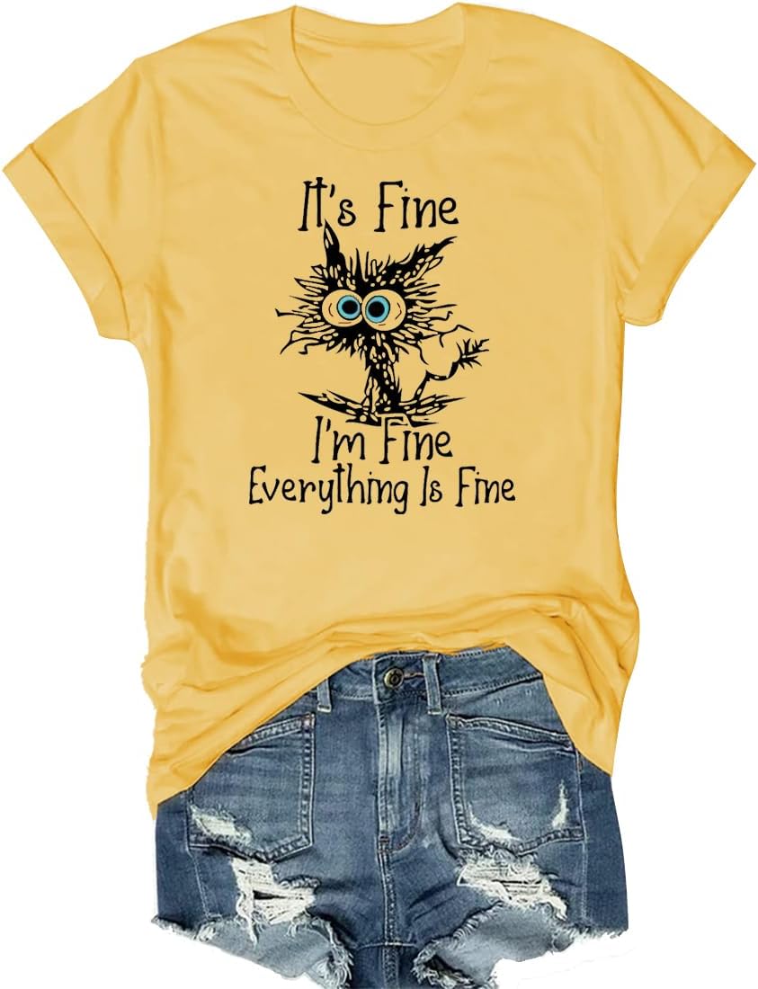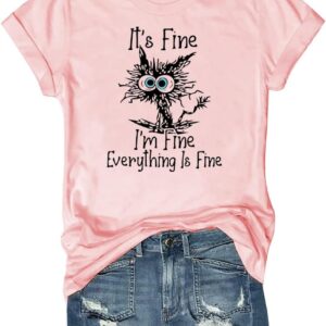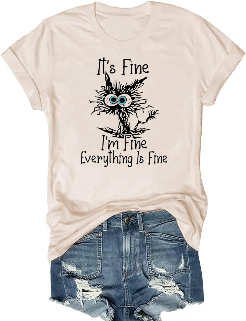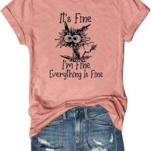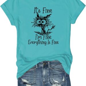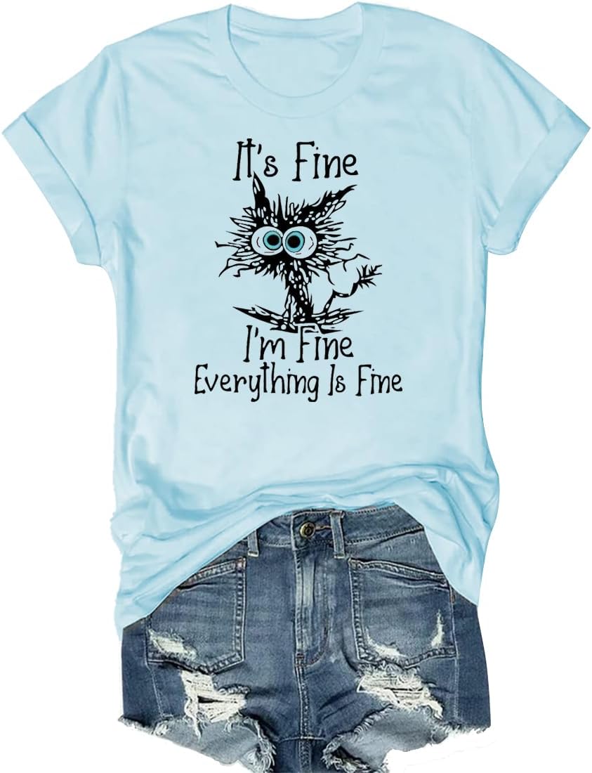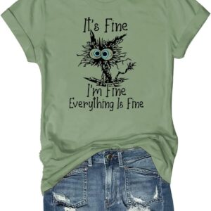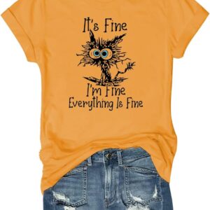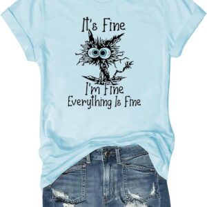 Women’s I’m Fine Everything is Fine T-Shirts Short Sleeve Sayings Loose Fit Casual Cute Cat Graphic Tee Blouse Tops