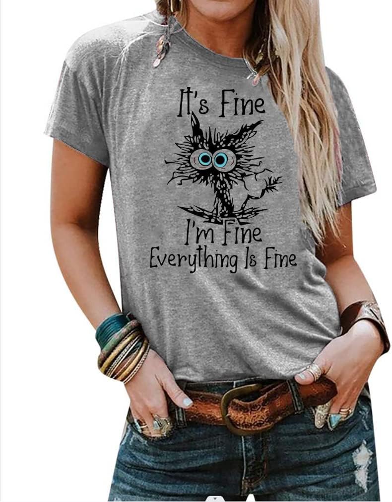 Women's I'm Fine Everything is Fine T-Shirts Short Sleeve Sayings Loose Fit Casual Cute Cat Graphic Tee Blouse Tops quantity