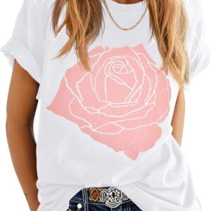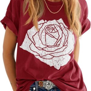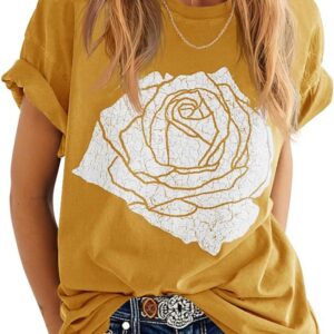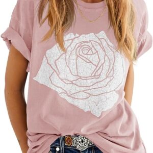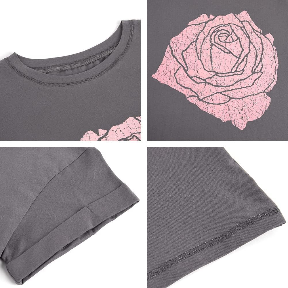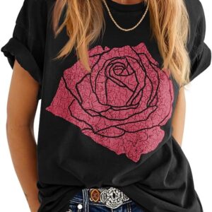 Womens Rose Graphic Tee T Shirt Loose Fit Summer Short Sleeve Casual Boyfriend Crew Neck Tops